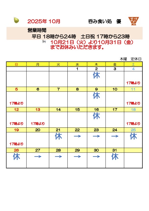 10月後半の10月21日(火)より10月31日(金)遅めの夏休みを頂きます。