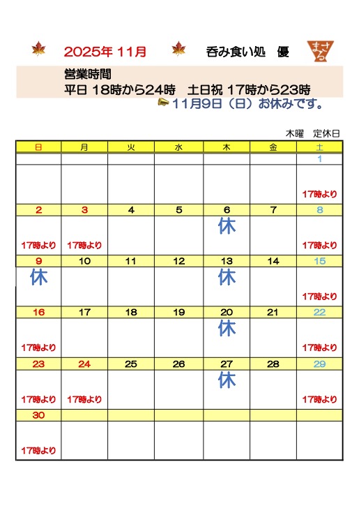 11月は、定休日の木曜日以外に、11月9日(日)にお休みをいただきます。